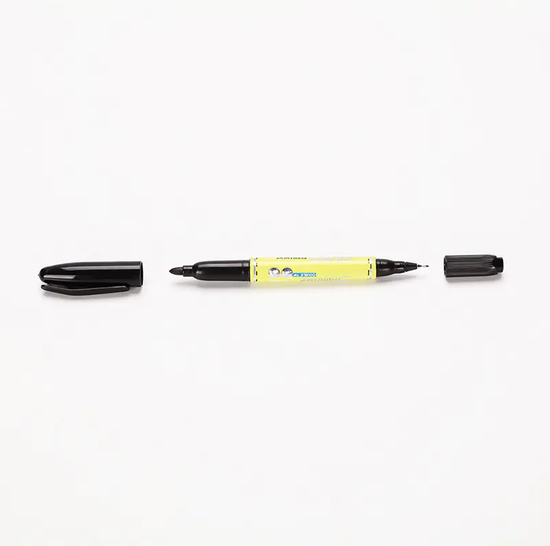 대부분의 이중 팁 형광펜은 한쪽 끝에는 쐐기 모양 또는 끌 모양의 넓은 팁이 있고 다른 쪽 끝에는 총알 또는 바늘 모양의 미세한 팁이 있습니다. 이들은 서로 바꿔 사용할 수 없으며 서로 다른 기능을 수행합니다.